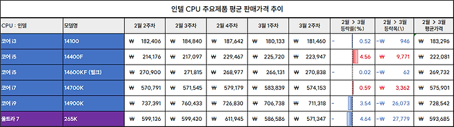 주요 제품별 가격 변동 내역은 코어 i3-14100(-0.52%), i5-14400F(+4.56%), i5-14600KF 벌크(-0.02%), i7-14700K(+0.59%), i9-14900K(-3.54%), 울트라7 265K(-4.64%) 등이다.