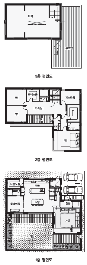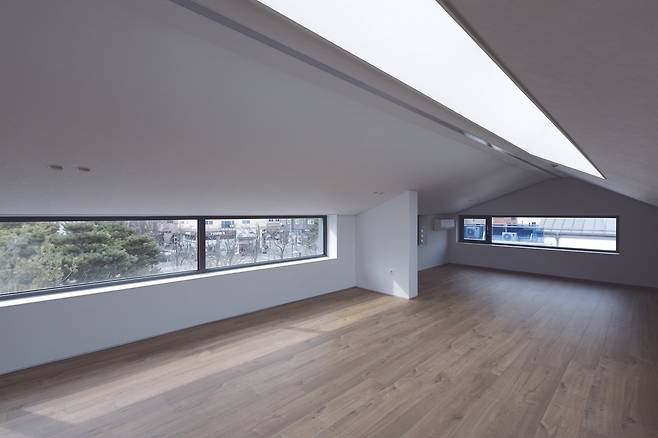 1층뿐만 아닌 경사지붕 아래 다락과 평지붕 위 넓은 옥상 또한 아이들이 뛰어놀 수 있는 또 다른 놀이터로서 기능한다.