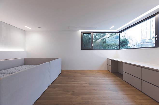 1층에 비해 한층 내밀하게 계획한 2층에는 100평이 넘는 단독주택답게 일반적인 면적보다 큰 아이들 각자의 방이 있다. 방과 더불어 드레스룸과 아이들이 물놀이할 수 있는 큰 조적 욕조 및 대형 세면대를 계획한 널찍한 욕실도 마련했다. 안방은 먼저 출근하는 남편을 위해 드레스룸과 욕실 동선을 필요에 따라 단독으로 사용할 수도 함께할 수도 있도록 계획했다.