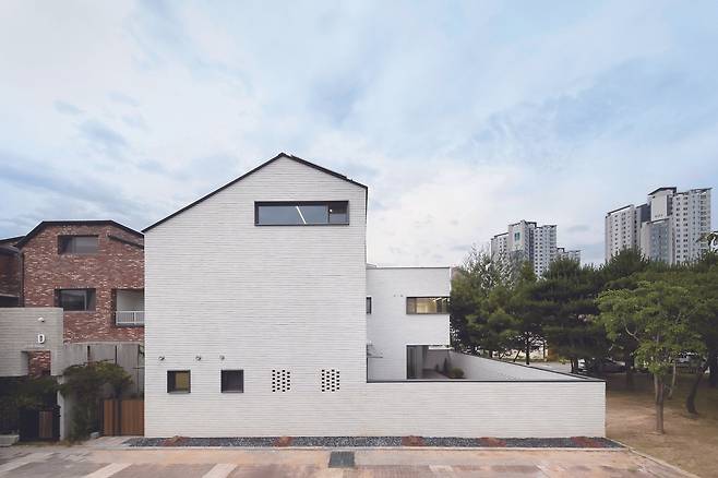 대지는 한쪽에 10m 폭의 도로와 다른 한쪽에 10m 폭의 인도를 접한다. 남쪽에는 푸른 소나무가 울창한 공원을 마주한다. 외장재로 선정한 벽돌이 이곳에서 자칫 무거운 분위기를 가질 수도