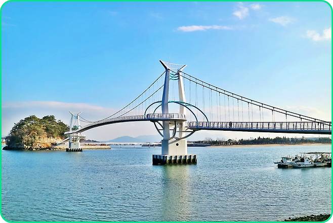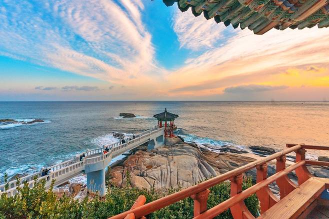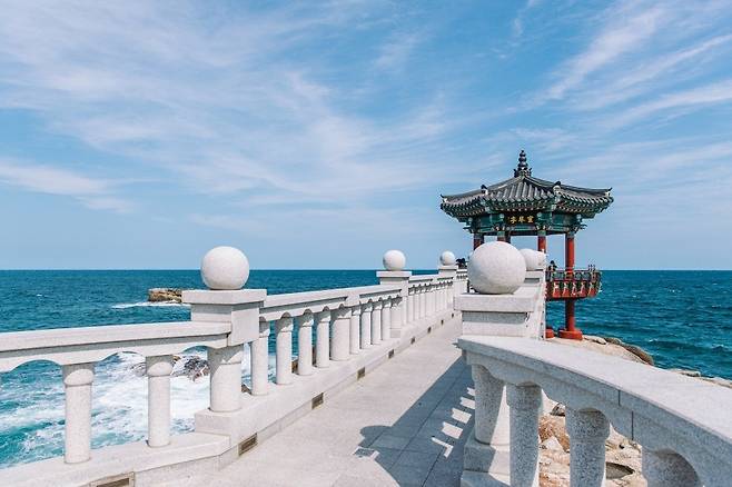 구름다리 끝에 위치한 이 정자에 서면 시야를 가로막는 것 없이 동해 바다가 파노라마처럼 펼쳐진다.