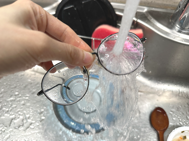 잘 닦은 안경을 깨끗한 물로 한 번 더 헹궈주시면 안경알이 코팅이 되어 물기가 자연스럽게 떨어지는 것이 보이실 거예요.