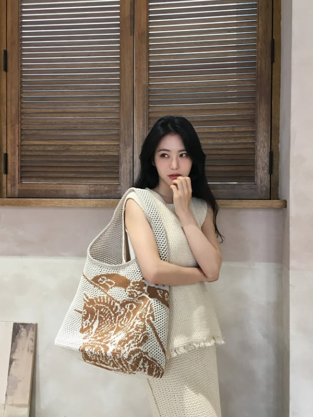 신예은이 선보인 버버리 EKD 크로셰 그물백은 내추럴하면서도 우아한 분위기를 자아낸다.