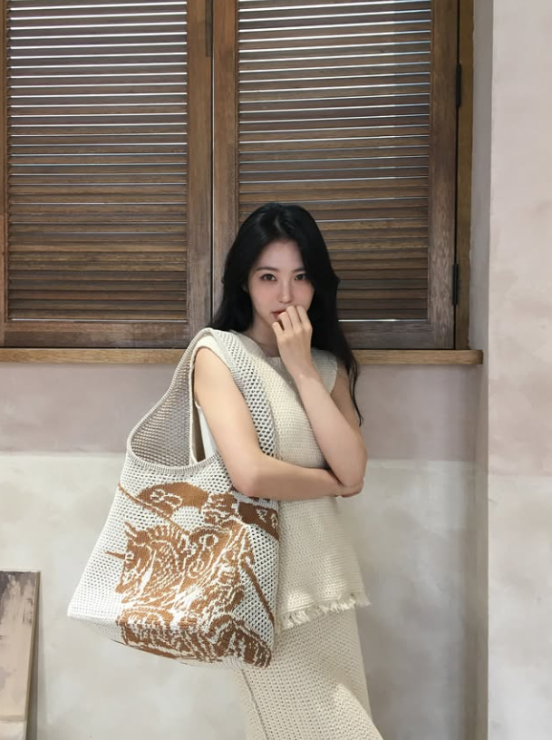 324만 명의 팔로워를 가진 그녀의 SNS에는 베이지 컬러의 니트 민소매 투피스와 함께 버버리(Burberry) 스몰 EKD 크로셰 그물백을 매치한 사진이 올라왔다.