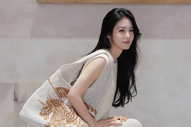 차분한 베이지 톤의 니트 투피스와 니트 소재의 숄더백 조합은 그녀만의 단아하면서도 고요한 무드를 강조했다.