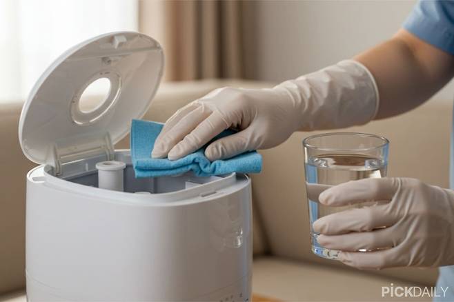 먼저 가습기 물통과 본체를 분리해 물통 내부의 물을 완전히 비워준다. 그다음 물통에 미지근한 물을 절반 정도 채우고, 식초 한 컵을 넣는다. 이 상태로 약 30분에서 1시간 정도 방치하면 식초의 성분이 물때와 세균을 깨끗하게 분해해 준다.