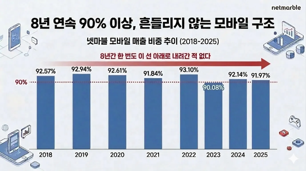 넷마블 사업보고서에 따르면 회사의 2025년 연결기준 매출은 역대 최대인 2조8351억원이다. 이 가운데 모바일게임 매출은 2조6075억원으로 91.97%를 차지했다. 2018년 이후 8년 연속 모바일 비중이 90%를 웃돌았으며 PC 게임 비중은 1.11%에 불과하다.