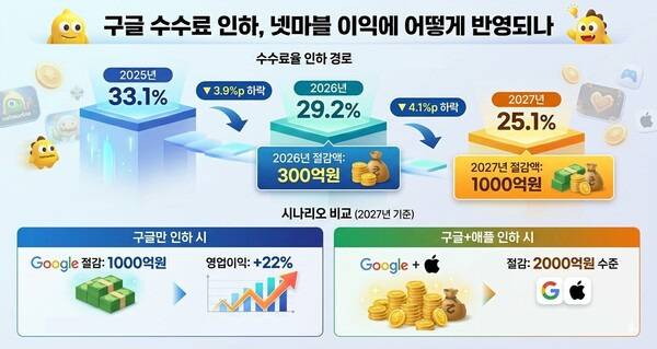 미래에셋증권은 구글 수수료 인하로 넷마블의 지급수수료 절감액이 2026년 300억원, 2027년에는 1000억원에 달할 것으로 추산했다. 지급수수료율도 2025년 33.1%에서 2026년 29.2%, 2027년에는 25.1%까지 낮아질 것으로 내다봤다.