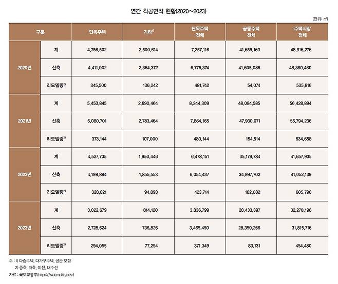 2023년 전체 주택의 착공면적은 3,227만㎡이며, 그중 단독주택(일반)은 302만 2,000㎡로 전체 주택의 9.3% 수준이다. 단독주택의 착공면적은 2021년 545만 3,000㎡에서 2023년 302만 2,000㎡(-44.6%)로 2년 연속 감소했다. 2024년 단독주택 착공면적도 2023년 대비 감소할 것으로 예상되는데, 이는 단독주택 공급 물량이 3년 연속 감소하는 것을 의미한다.