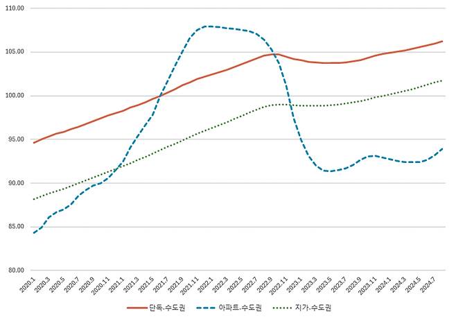 단독주택 매매가격지수를 보면, 매년 꾸준한 상승률을 보이고 있다. 즉, 아파트 매매가격은 급상승 또는 급락 등 가격의 변화 폭이 크다. 하지만 단독주택 매매가격은 큰 변화 없이 대체로 꾸준히 상승하는 경향을 보이고 있다. 전년 대비 증감률을 비교해 보면, 2022년에는 단독주택(수도권) 1.7%, 아파트(수도권) -9.7%, 지가(수도권) 1.1%였는데 2023년에는 각각 0.7%, -2.0%, 1.1%로 나타났다. 즉, 단독주택과 아파트는 매매가격이 동행하지 않고 변화 폭이 다른, 상호 독립된 시장으로 볼 수 있다.