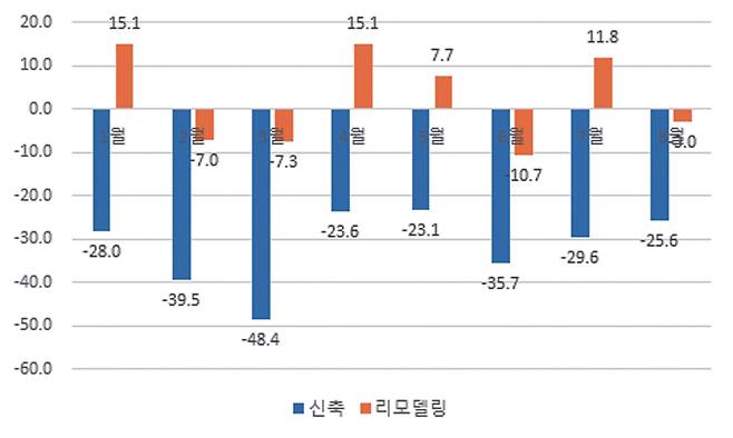 주택경기 불황으로 단독주택 신축 수요는 축소됐지만, 기존 주택의 리모델링 수요는 증가하는 경향성이 나타나고 있다. 즉, 새 주택으로 이전이 곤란하니 기존 주택을 고쳐 쓰자는 유인이 크다는 것을 의미한다.