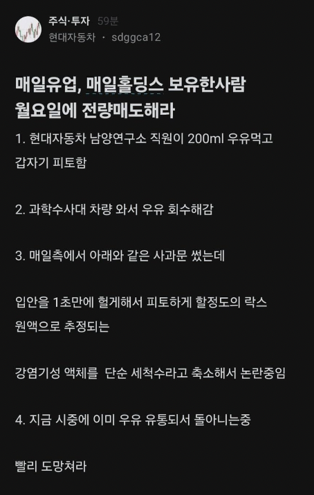 이어 “제품에서 락스 원액으로 보이는 강염기성 물질이 검출됐다. 단순 세척수로 축소하려는 움직임이 있다”며 매일유업과 매일홀딩스 주식을 전량 매도하라는 경고까지 남겼습니다.