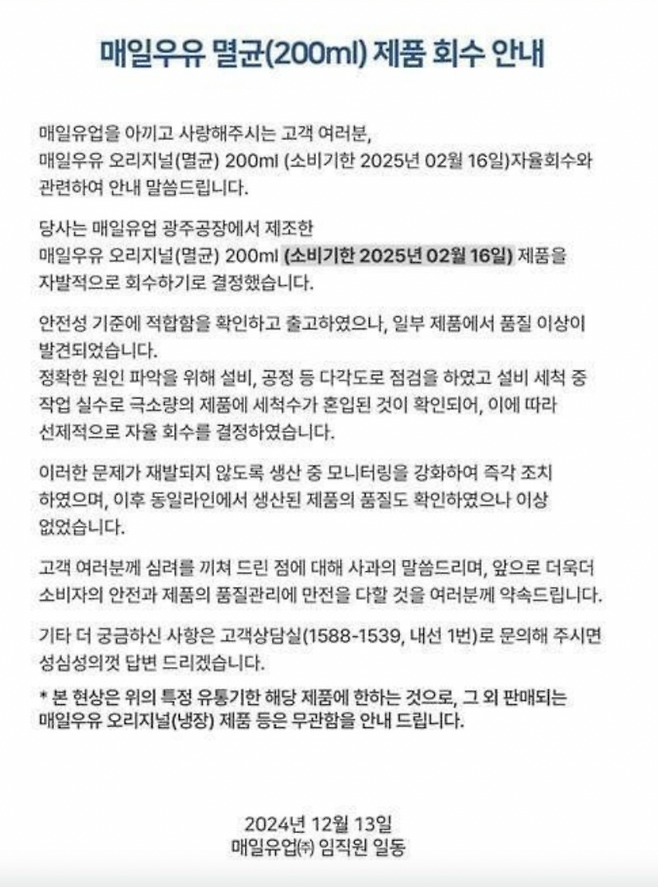 사건이 빠르게 확산되자 매일유업은 12월 13일 긴급 공지를 통해 공식 입장을 발표했습니다. 회사 측은 “광주공장에서 제조된 매일우유 오리지널(멸균) 200ml 제품에서 품질 이상이 발견되어 선제적으로 자율 회수를 결정했다”고 밝혔습니다.