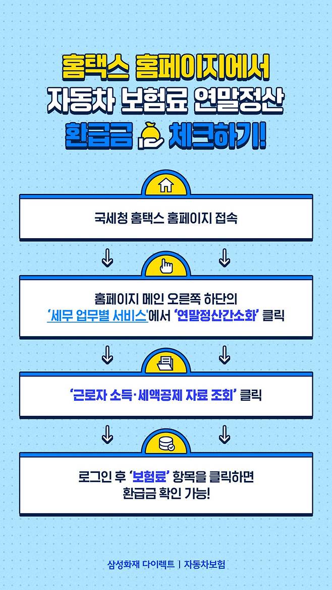 자동차 보험료 연말정산 환급금은 국세청 홈택스에서 확인 가능합니다. 홈택스 홈페이지에 들어가면 오른쪽 하단 ‘세무 업무별 서비스'에서 ‘연말정산간소화'를 찾아 누르면 됩니다. 이후 ‘근로자 소득·세액공제 자료 조회’ 버튼을 누르세요! 그러면 로그인 화면이 뜰 텐데요, 이때 로그인을 한 뒤 보험료 항목을 클릭하면 환급금을 확인할 수 있습니다.