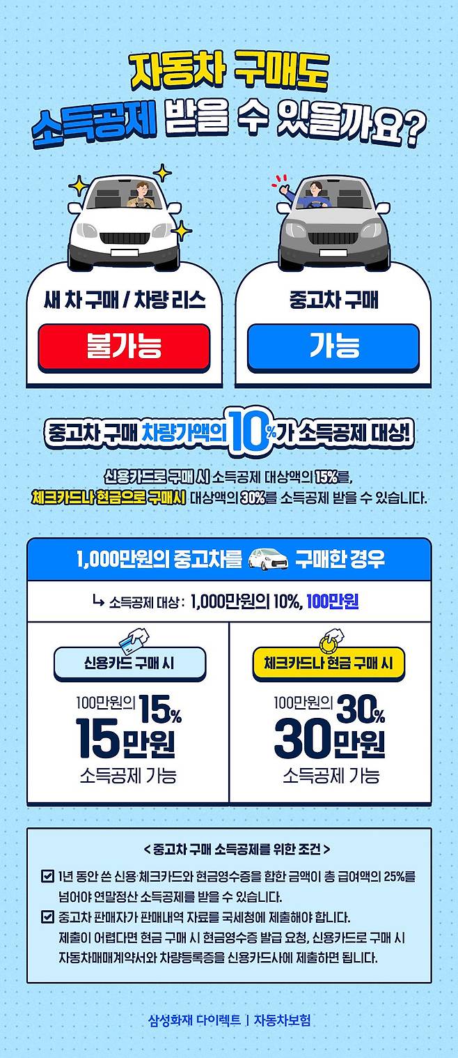 자동차 구매는 금액이 큰 만큼 공제를 받을 수 있을지 많은 분들이 궁금해하시는데요. 아쉽게도 새 차를 사거나 차량을 리스하는 경우에는 소득공제를 받을 수 없습니다. 하지만! 중고차를 구매했다면 소득공제를 받을 수 있습니다!
