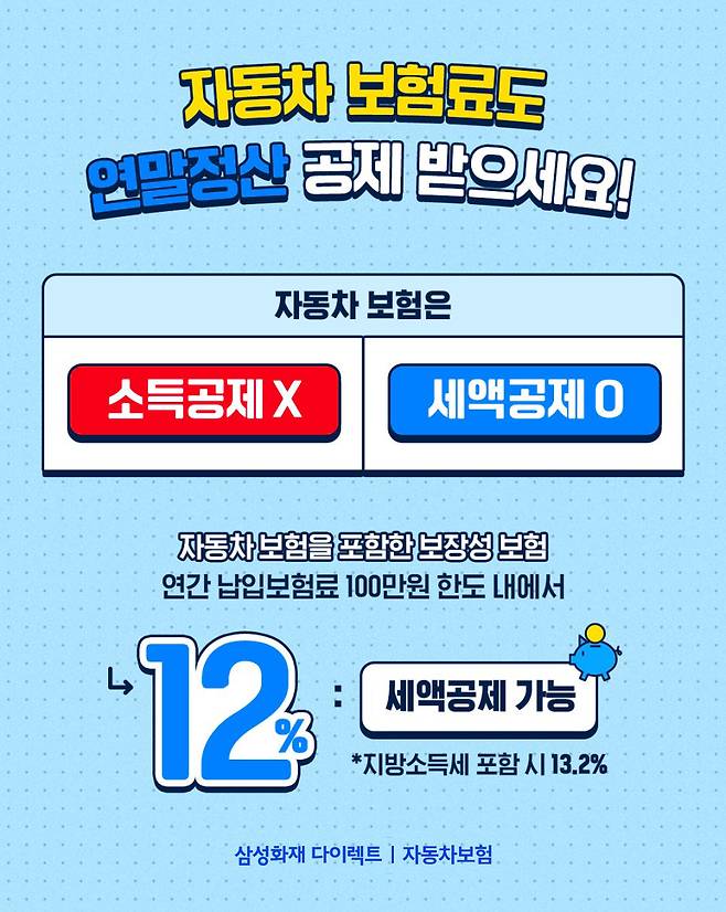 중고차 구매뿐 아니라 자동차 보험료도 공제를 받을 수 있습니다! 중고차 구매와는 다르게 자동차 보험은 보장성 보험이기 때문에 소득공제가 아닌 세액공제 대상인데요. 자동차 보험을 포함해 보장성 보험에 가입한 사람이라면 연간 납입보험료 100만 원 한도 내에서 12%(지방소득세 포함 시 13.2%)를 세액공제 받을 수 있습니다.