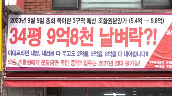 일부 조합원들은 고분양가와 추가 분담금 우려로 인해 북아현 3구역 정상화추진위원회를 만들었다. 사무실을 차린 정상화추진위는 “전용면적 84㎡ 34평 조합원 예상 분양가는 5억4000만원에서 약 10억원으로 늘어난다”며 “조합원들이 분담금 폭탄을 맞게 됐다”고 밝혔다. 권혁중 북아현3구역 정상화추진위원장은 “2011년 대비 조합원 분양가가 두 배가 더 올랐다”며 “최소 2억원에서 많게는 5억원 이상 분담금을 낼 수 있는 여력이 없다”고 했다.