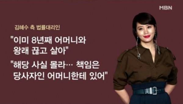 김혜수 측은 이후 입장을 통해 "무조건 책임을 떠안는 방식으로는 문제를 해결할 수 없다는 것이, 오랜 고통의 시간을 견디며 얻은 결론"이라며 "문제의 책임은 김혜수가 아닌 당사자인 어머니에게 있다"고 밝혔다.