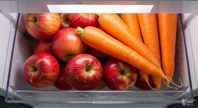 사과는 과일 전용 서랍이나 칸막이 위쪽에 두고, 당근은 신문지나 키친타월로 감싸 별도의 비닐봉투에 넣는 것이 낫다. 이렇게 분리하면, 수분 증발도 막을 수 있다.