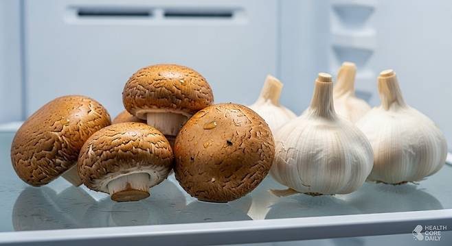 버섯은 통기성이 있는 종이봉투에 담는 것이 좋다. 냉장고의 채소 칸보다는 본체 중단부, 즉 서늘하지만 습기가 덜한 구역이 적합하다. 반면, 마늘은 껍질째 통풍이 잘되는 바구니나 유리병에 담아 보관하면 된다.