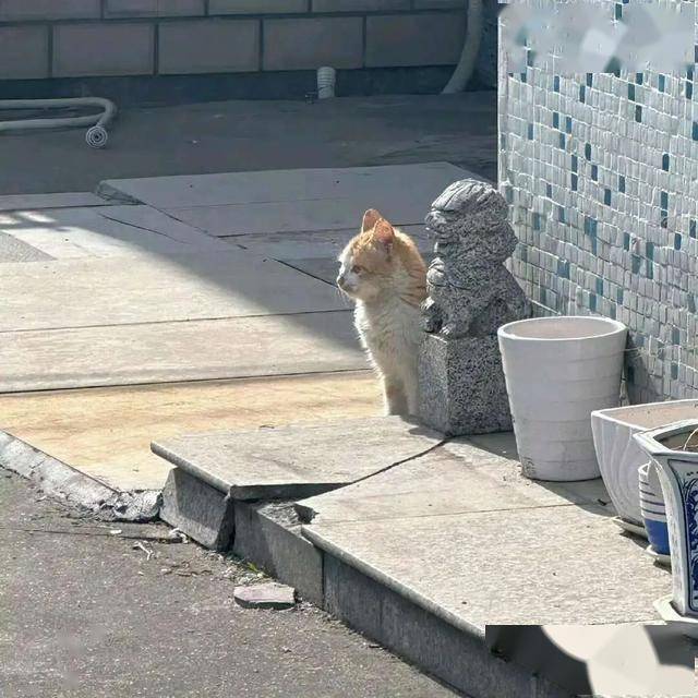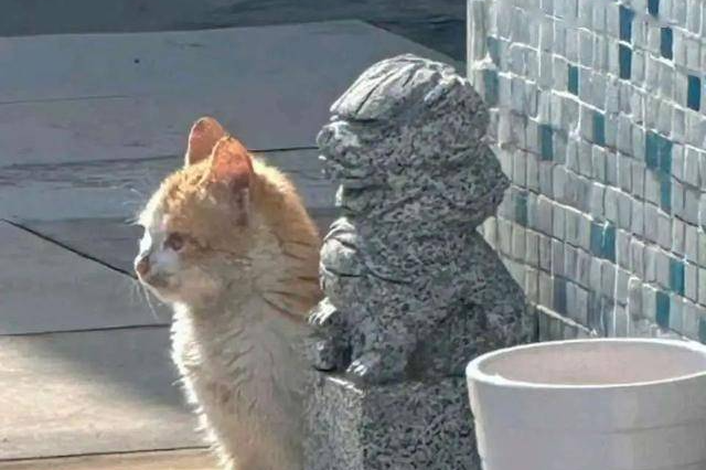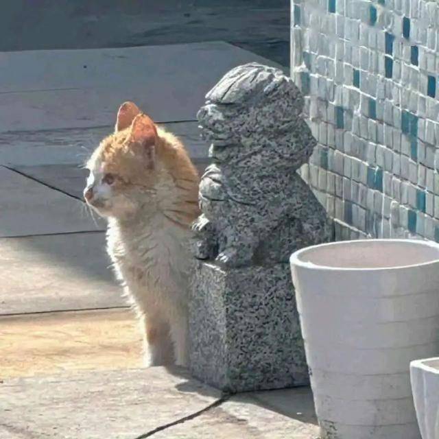 석상 사자는 여전히 위엄 있는 자세를 유지하고 있지만, 고양이는 나른하게 옆에 서서 고개를 꼿꼿이 들고 가슴을 펴고 있습니다.