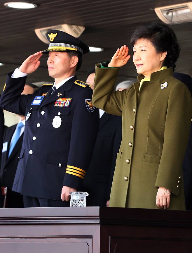 | ▲ 2013년 3월 14일, 당시 박근혜 대통령과 서천호 경찰대학장이 경기도 용인시 경찰대학교에서 열린 제29기 경찰대 졸업 및 임관식에서 졸업생 대표의 경례에 거수경례로 답하고 있다. |