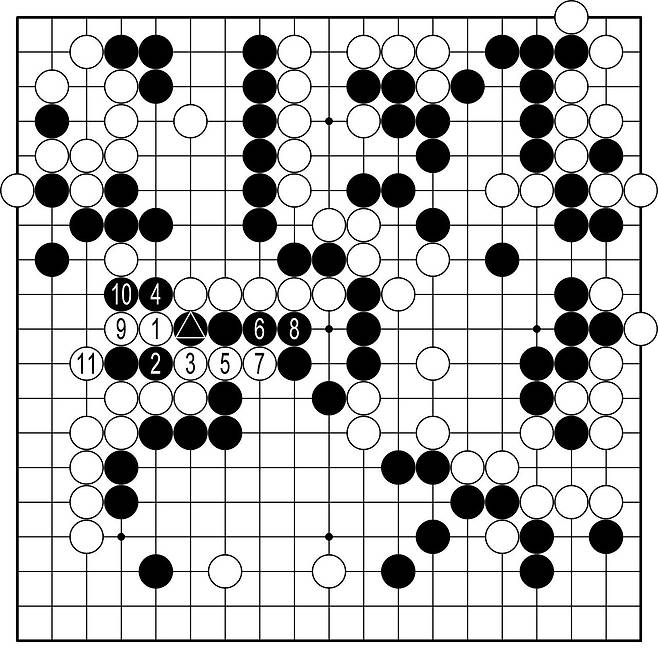 장면⑨=바둑판은 전쟁터다. 격렬해지기는 쉽고 멈추기는 어렵다. 흑▲로 절단하자 백의 연결은 불가능해 보인다. 백1로 젖히자 흑2의 차단. 마침 백은 초읽기에 몰렸다. 한데 거꾸로 끊어버린 백의 한 수(백3)가 사태를 역전시켰다. 살고자 버둥거리면 안 보인다. 죽기를 작정하면 숨은 그림이 보인다. 흑10으로 백 다섯 점을 잡았으나 백도 11로 흑 두 점을 잡았다. 게다가 흑은 중앙 수비가 불가피해서 중요한 선수가 백에게 돌아왔다. 흑은 잡으러 가서 성공했지만, 결론은 손해였다. 바둑은 미세해졌다.