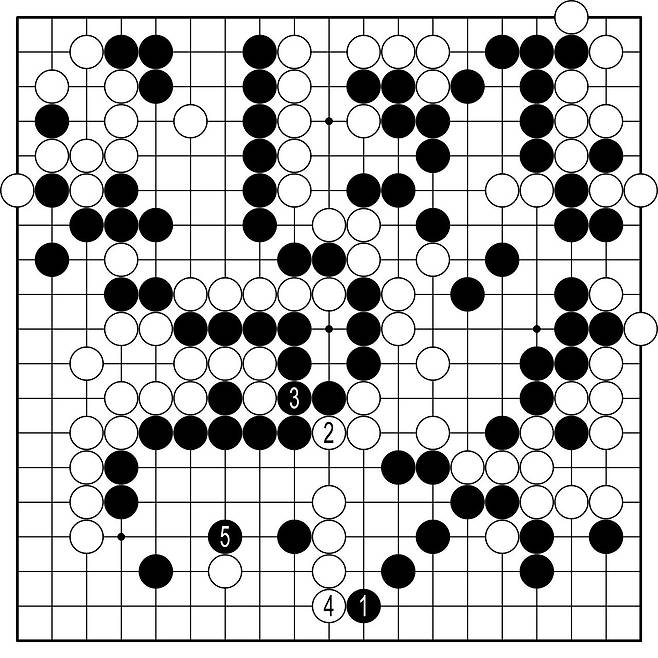 ◆AI의 계산=계가가 계속 출렁이고 있다. 작은 차이지만 역전이 반복된다. AI는 흑1을 선수하고 5로 눌러두는 게 최선이며 이랬으면 흑 우세의 바둑이라고 한다. 인간은 공감하기 쉽지 않은 그림이다.