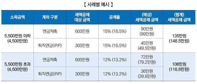 이렇게 변경된 기준으로 연금계좌 세액공제의 실제 효과를 계산해 보면 아래 표와 같다. 5,500만원 이하의 소득자를 기준으로 할 때 납입한도까지 최대 불입했다고 가정하면, 15%(지방소득세 포함 16.5%) 공제율로 최대 135만원(지방소득세 포함 148.5만원)을 세액공제 받을 수 있다. 5,500만원을 초과하는 경우에는 최대 108만원(지방소득세 포함 118.8만원)을 세액공제 받게 된다.
