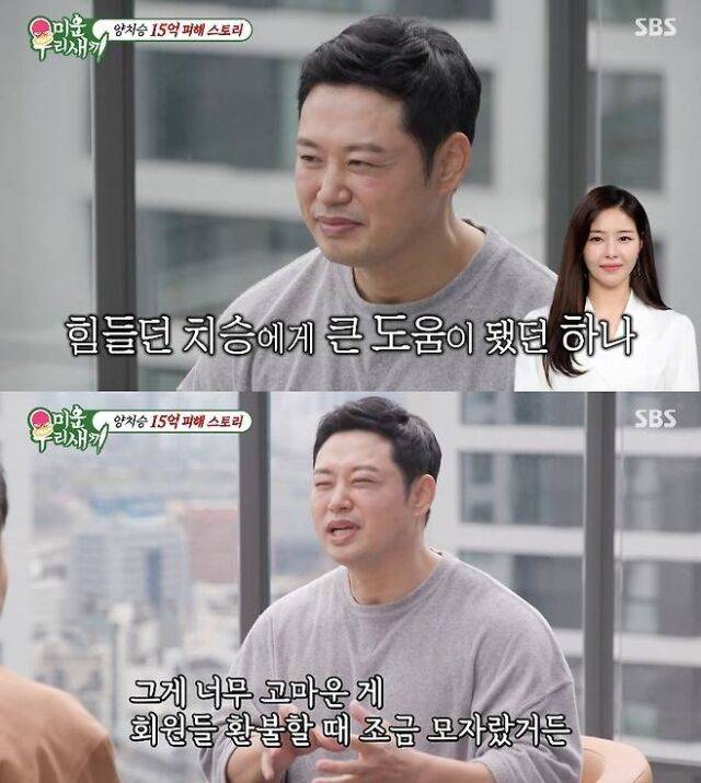 양치승은 최근 SBS ‘미운 우리 새끼’에 출연해 헬스장 운영 당시 기부채납 문제로 폐업을 겪으며 약 15억 원 손해를 입었다고 털어놨다. 당시 회원 환불 문제까지 겹치며 힘든 시간을 보냈다고 고백했다.