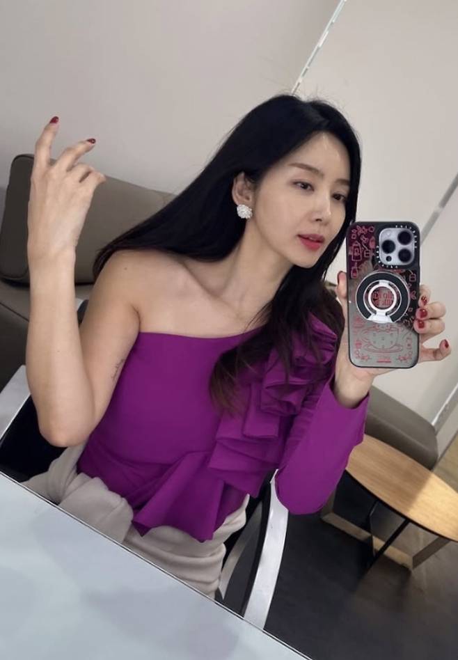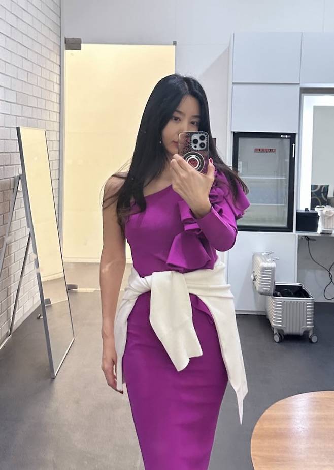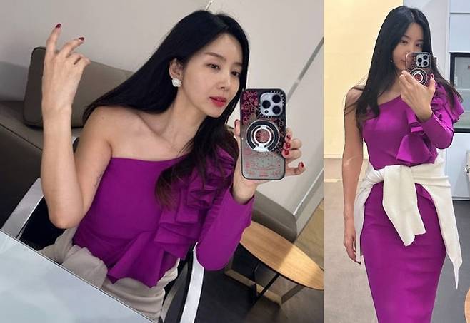 배우 박솔미가 세련된 퍼플 원숄더 드레스 스타일링을 담은 사진을 인스타그램에 공개했습니다.