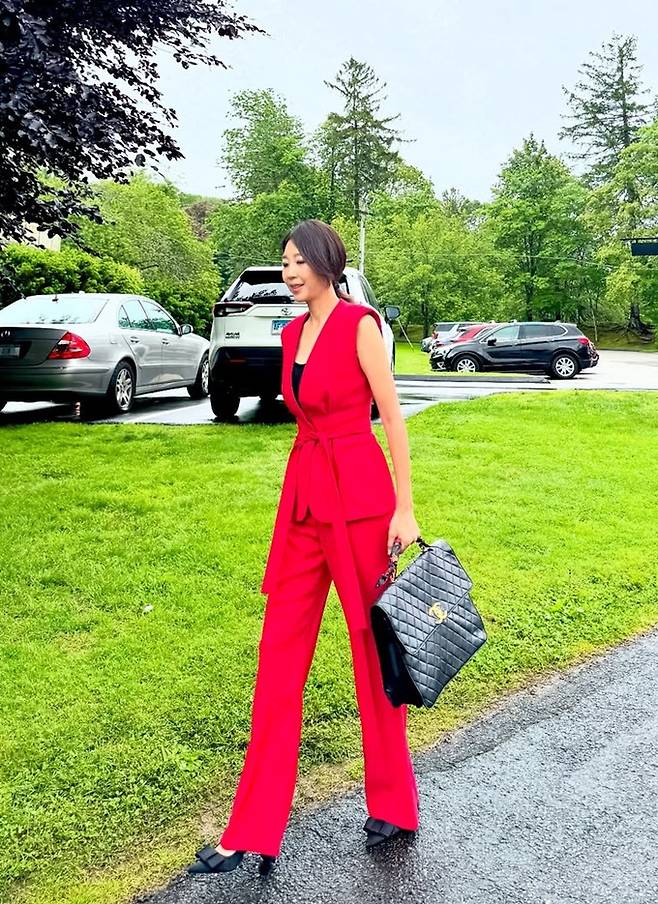 가수 윤종신의 아내이자 전 테니스 국가대표 전미라가 강렬한 레드 슈트로 175Cm 기럭지의 당당한 파워우먼룩을 선보였다.