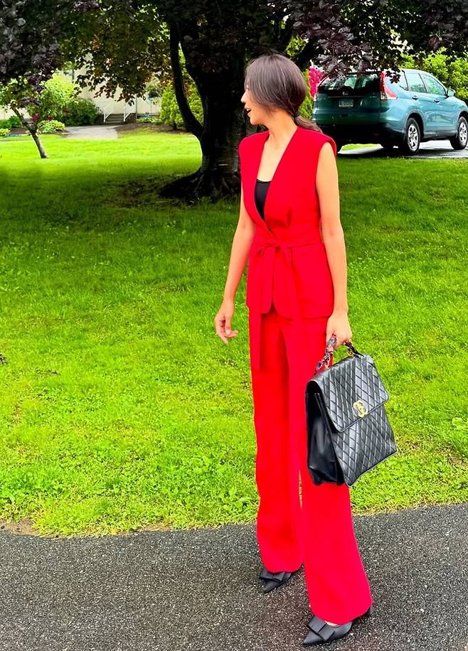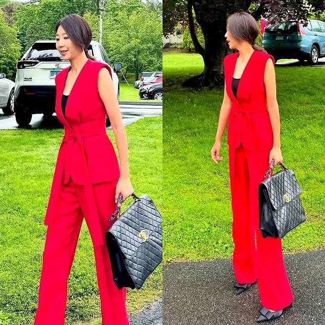 공개한 사진에서 전미라는 강렬하면서도 레드 컬러의 팬츠와 벨티트 베스트 재킷 슈트룩으로 슬림하면서도 파워풀한 외출 스타일을 선보였다.