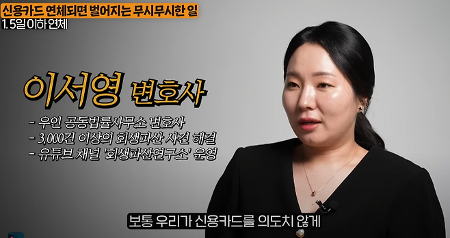 본 콘텐츠는 유튜브 채널 지식인사이드의 영상 "신용카드 대금 연체되면 생기는 일, 1일, 5일, 90일, 6개월 기간별로 알려드립니다."에서 회생파산 전문 이서영변호사가 설명한 내용을 바탕으로 작성되었습니다.