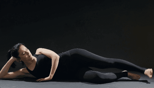오른쪽 측면을 바닥에 대고 누운 상태에서 시작하며, 왼쪽 다리를 공중으로 들었다가 내리는 동작을 반복합니다. 자세를 바꿔 오른쪽 다리를 드는 동작으로 운동하세요.