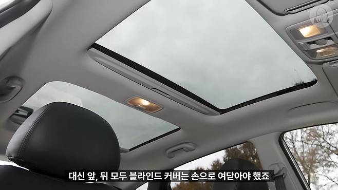 뒷좌석 공간도 전고를 낮추면서 헤드룸에서는 약간의 손해를 봤지만, 레그룸을 비롯한 공간은 충분했고 열선 시트와 암레스트 등 편의 장비도 무난했어요. 무엇보다 르노삼성의 'QM5'가 한 발 앞서 선보여 센세이션을 일으켰던 파노라마 썬루프가 적용돼 외관에서의 드레스업 효과와 더불어 실내 개방감이 상당히 좋아졌습니다. 대신 앞뒤 모두 블라인드 커버는 손으로 여닫아야 했죠.