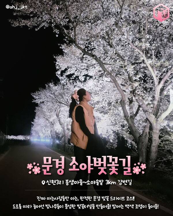 아는 사람들만 아는 벚꽃 명소, 문경 소야벚꽃길입니다. 도로를 따라 길게 늘어선 벚나무들이 풍성하게 벚꽃을 틔워 아름다운 풍경을 선사해주는데요. 밤이 되면 백색 조명이 점등되어 순백색으로 빛나는 벚꽃길 아래를 산책하기 좋습니다.