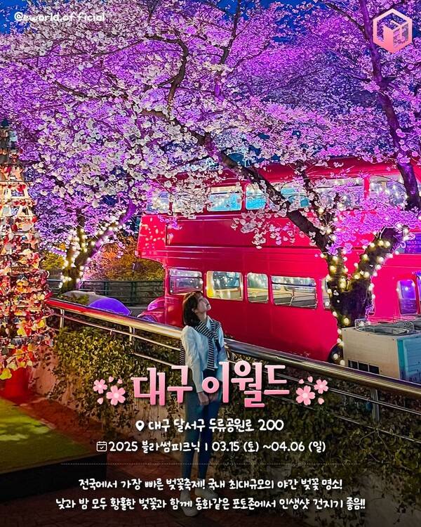 전국에서 가장 빨리 벚꽃이 개화하는 곳이자, 국내 최대 규모의 야간 벚꽃 명소로 손꼽히는 대구 이월드입니다. 동심으로 돌아간 듯 낮과 밤 모두 황홀한 벚꽃과 어우러진 동화같은 포토존에서 인생사진을 찍기 좋은 벚꽃 명소이죠.