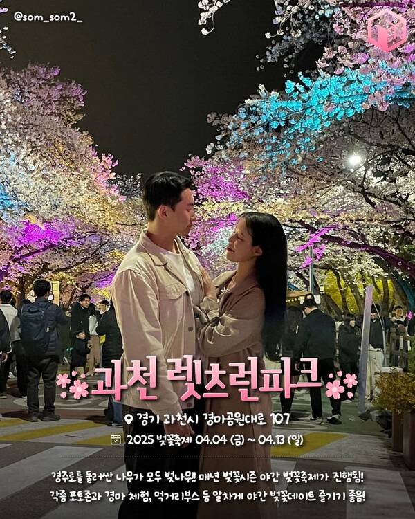 진한 분홍 조명과 보랏빛 조명이 번갈아가며 벚꽃을 비춰 마치 판타지 영화 속에서나 볼 수 있을법한 벚꽃 터널 산책로가 펼쳐집니다. 벚꽃 만개 시기가 지나 방문하더라도, 통통한 겹벚꽃이 금세 피어나 벚꽃의 아쉬움을 달래기에도 좋죠.
