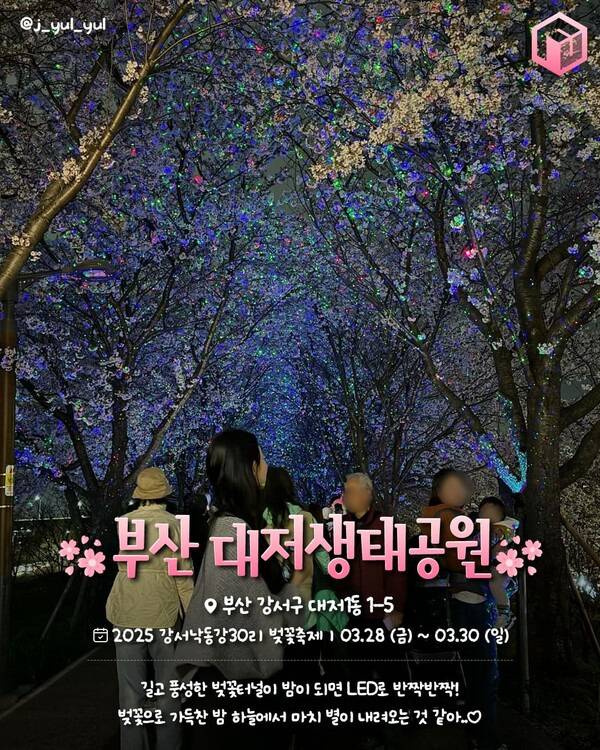 낙동강을 따라 조성된 대저생태공원은 매년 봄 유채꽃과 벚꽃이 만발하며 완연한 봄 풍경이 펼쳐집니다. 특히 벚나무가 길게 늘어선 벚꽃 터널길은 밤이 되면 led 조명이 점등되는데요. 마치 벚꽃으로 가득찬 하늘에 빼곡한 별이 쏟아내리는 듯한 신비로운 분위기를 만끽할 수 있습니다.