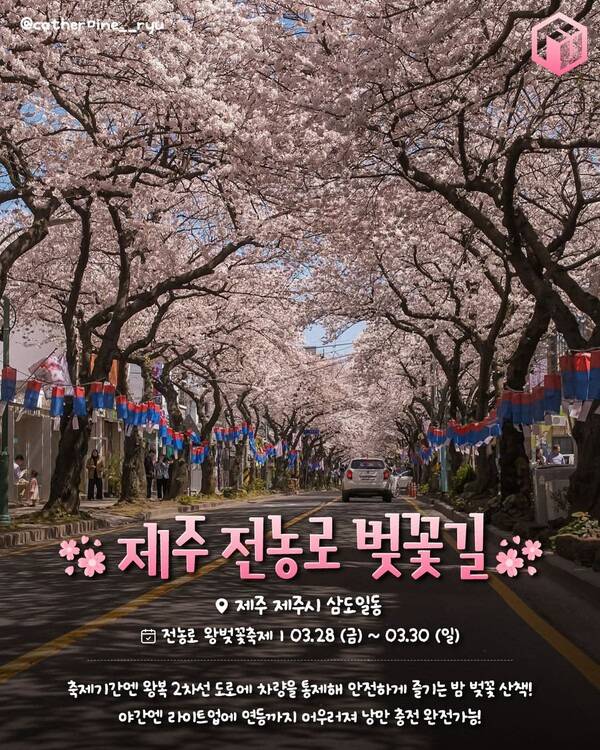 제주에서 가장 유명한 벚꽃 명소 중 하나인 전농로 벚꽃길입니다. 왕복 2차선 도로를 따라 늘어선 왕벚나무들이 피워낸 왕벚꽃의 향연은 동화 속 한 장면을 연상케합니다.