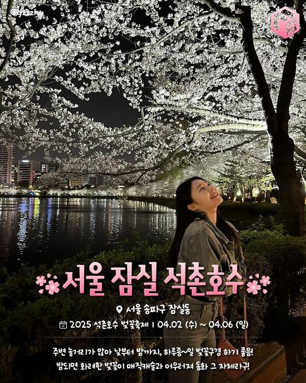 롯데월드, 쇼핑몰 등 주변 놀거리가 많아 낮과 밤 모두 벚꽃 나들이를 즐기기 좋은 서울 잠실의 석촌호수입니다. 호수 가장자리를 따라 조성된 벚꽃길은 도심 속 동화같은 산책로가 되어주는데요.