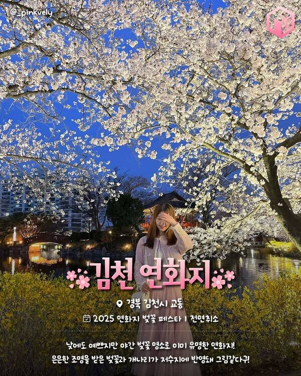 밤이 되면 조명을 받은 벚꽃이 잔잔한 호수에 반영되어 마치 한 폭의 수채화같은 풍경이 펼쳐집니다. 반짝이는 물결과 호수 위 정자에도 불이 켜져 낭만적인 야경이 완성됩니다. 2025 연화지 벚꽃축제는 경북지역의 대형 산불로 인해 취소됐지만, 푸드트럭과 교통 통제 등 최소로 운영될 예정입니다.