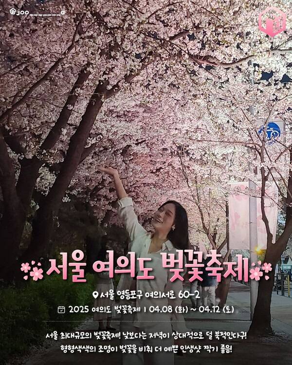 밤이 되면 형형색색의 조명이 벚꽃을 비춰 더욱 아름다운 인생 사진을 남길 수 있을 뿐 아니라, 축제 기간 진행되는 다채로운 거리 버스킹 공연과 먹거리 부스 등을 즐기기에도 좋죠. 2025 여의도 벚꽃축제는 탄핵심판으로 인해 4일 미뤄진 4월 8일부터 4월 12일까지 개최됩니다.