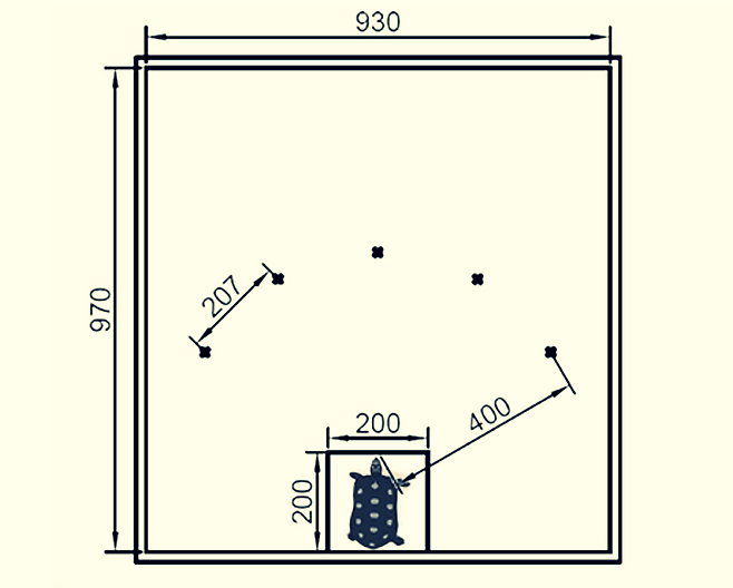 실험은 간단했다. 가로 930㎜, 세로 970㎜에 높이가 낮은 사각 펜스 안에 먹이가 들거나 들지 않은 접시 5개를 207㎜ 간격으로 배치하고 거북이들에게 먹이가 든 접시를 학습하게 했다. 각 접시와 거북이 사이의 거리는 400㎜였다. 이후 거북이들이 학습하지 않은 곳에 접시를 놓고 거북이들의 반응을 관찰했다.