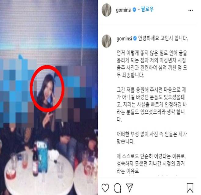 당시 고민시는 인스타그램에 “좋지 않은 일로 인해 글을 올리게 되는 점과 저의 미성년자 시절 음주 사진 관련 심려 끼친 점 모두 죄송하다”는 내용의 글을 올렸습니다.