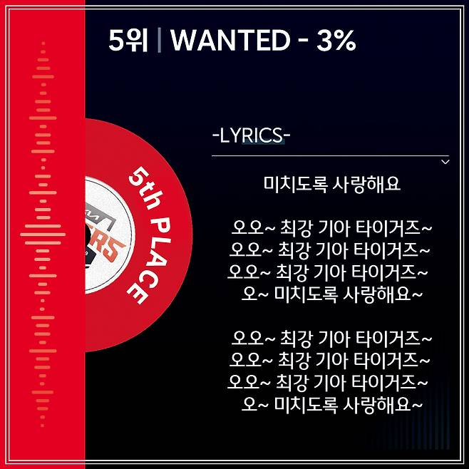사랑을 표현하는 색인 빨강이 팀 컬러인 만큼 KIA의 응원가 중엔 팀을 향한 팬들의 사랑을 표현하는 곡이 많다. 5위로 선정된 WANTED가 대표적인 곡. 영국의 혼성 그룹 'The Dooleys'의 동명의 곡이 원곡인데, KBO리그 응원가 저작권 이슈가 터졌을 때 사용이 금지됐다가 문제가 해결된 뒤 부활했다. 선수가 안타를 쳤을 때나 상대의 작전시간에 부르며, 가사는 ‘미치도록 사랑해요’, ‘최강 KIA 타이거즈’와 박자에 맞춘 ‘오~’로만 구성돼 간단명료하고 중독성이 있다. 특히 승패에 상관없이 미치도록 타이거즈를 사랑하겠다는 열렬한 애정을 느낄 수 있어 팬 사랑을 느끼기엔 더할 나위 없다. 득점 기회를 잡았을 때 팬들이 벌떡 일어나 따라 부르기 시작하면 승리의 분위기가 최고조가 됨을 느낄 수 있다.