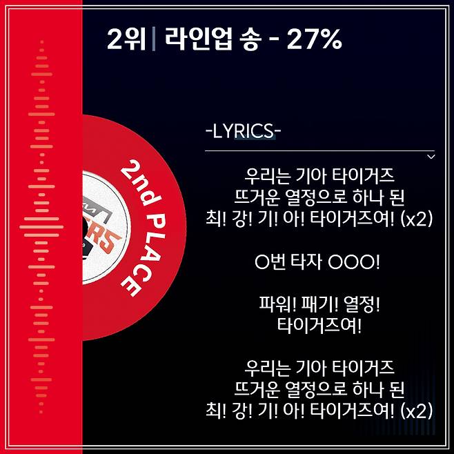 각 팀이 첫 공격을 시작하면서 부르는 라인업 송. 시작부터 끝까지 웅장함과 비장함을 자랑하는 KIA의 라인업 송은 다른 응원가를 제치고 상위권을 차지했다. 베토벤의 ‘비창 소나타’를 빠르게 변주한 ‘베토벤 바이러스’를 강렬한 일렉트릭 바이올린으로 연주해 반주로 사용했다. 많은 이들에게 익숙한 멜로디라 따라 부르기 쉽다. 라인업 송인 만큼 1회 첫 공격 시작 전에 부르고 팀이 승리한 때도 부른다. 일부러 이 노래를 부르려고 야구장에 간다는 팬이 있을 정도다.