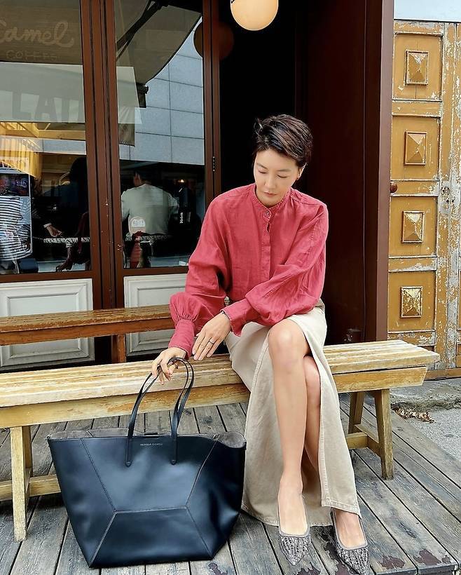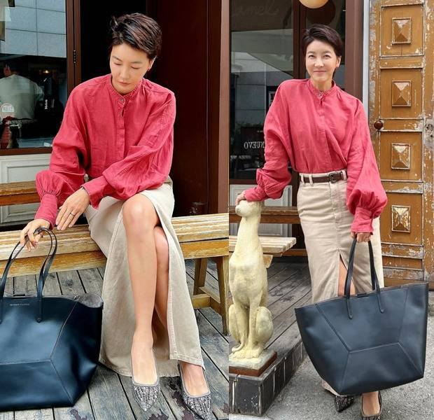 진서연은 부드러운 코튼 소재의 베이지 롱 스커트에 깊은 슬릿 디테일로 세련된 실루엣을 완성했고, 레드빛 박시 셔츠를 무심하게 매치해 스타일리시한 무드를 더했습니다.