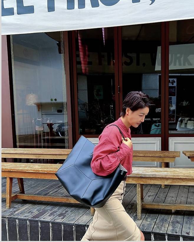 여기에 포인트가 된 건 블랙의 대형 가방. 마치 ‘가방이 사람을 드는’ 듯한 압도적인 사이즈와 진서연의 시크한 존재감이 완벽한 조화를 이루며 화보 같은 일상을 연출했습니다.